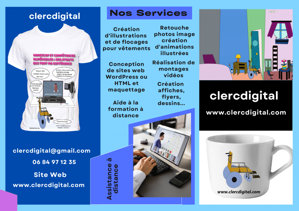 clercdigital est une micro entreprise qui proposes ses services et ses compétences dans la création de sites internet WordPress, la création de montages vidéos, de documents illustrés ou animés, la mise en page de documents, en fonctions des types de projets que vous souhaiter faire réalisés sont mises en place avec vous.. Clercdigital s’adapte à vos projets à travers la discutions et le conseil au préalable. N’hésitez pas à découvrir notre site et à prendre contact pour vos projets ou vos questions.