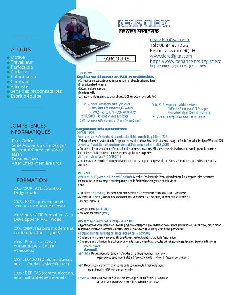 Web Designer, Développeur P.A.O. et Conseiller handicap / associatif dans le numérique. Ce site ainsi que ma page facebook clercdigital ont pour objectif de promouvoir mes réalisations et mes compétences dans le domaine du multimédias